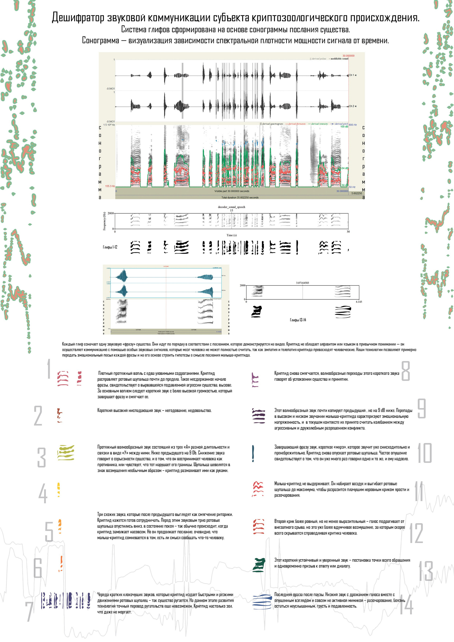 This interdisciplinary project is a reflection on animal agency and its means of communication with other living beings, including humans. To achieve this, the artist create a cryptozoological species and develops a language for it in the form of sound signals and their approximate decoding.